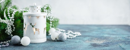 Composition of the Christmas decorations . Bright ornaments, hand lantern and spruce branches isolated on white background. Wide photo.