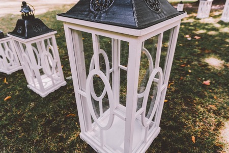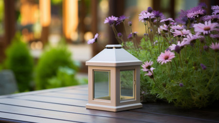 white lantern with delicate white flowers on a wooden table, styled in light magenta and dark beige. this tranquil gardenscape is reminiscent of cfa voysey's designs, featuring bold structural elements in dark bronze and light amber. captured with the zeiss milvus 25mm f/1.4 ze lens. ai generated