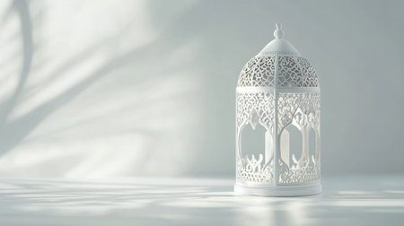 An all-white Arabic lantern with intricate designs, placed against a plain white background. The simple, yet elegant aesthetic is ideal for contemporary or cultural design concepts.