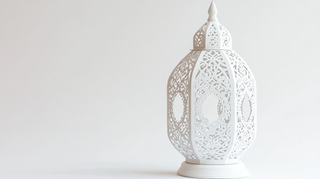 A white Arabic lantern with detailed patterns, highlighted on a crisp white background. The minimalist design emphasizes cultural tradition with a modern twist, perfect for decor themes.