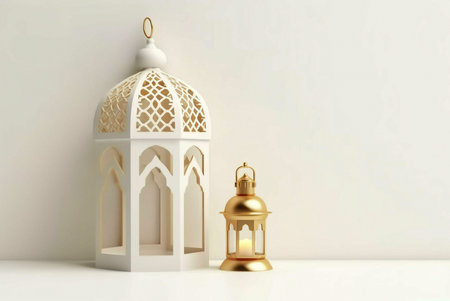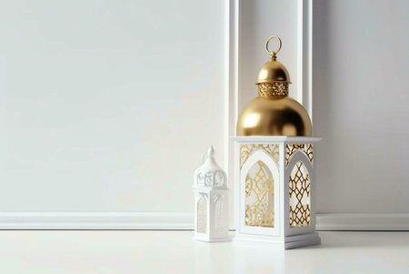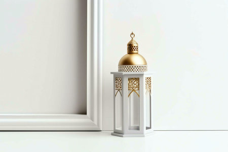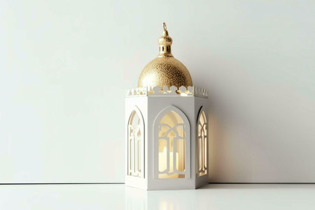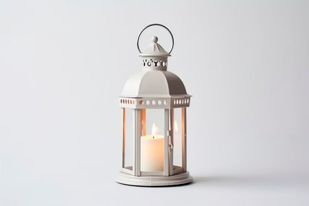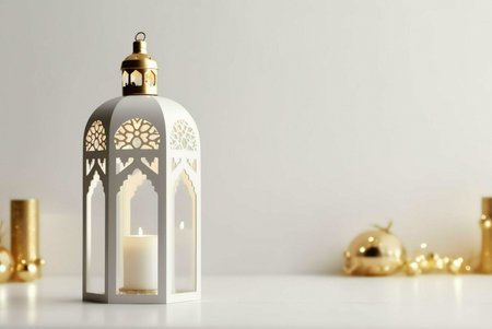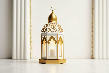 A golden and white lantern with intricate designs, lit by a single candle, against a white backdrop. It symbolizes the spirit of Ramadan and the holy month.