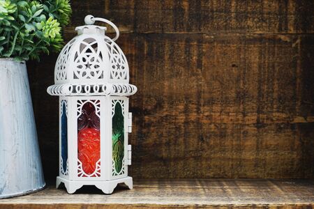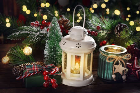 White lantern on wooden background Christmas decorations and lights,card template with copy space