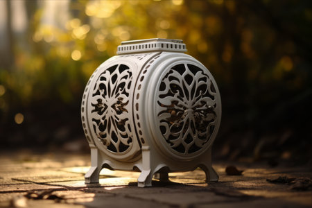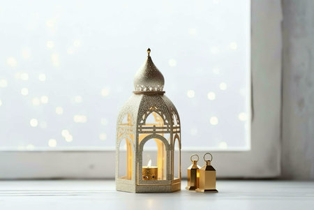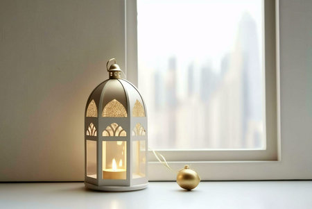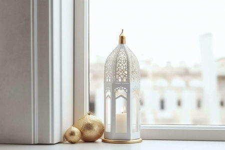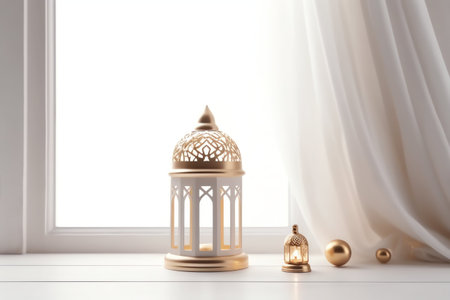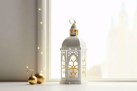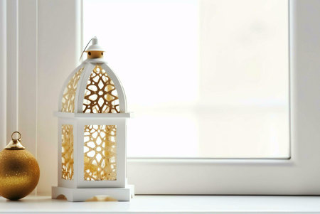 A beautifully crafted golden and white lantern intricately with designs against a window background, symbolizing the spirit of Ramadan.