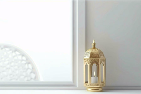 A golden lantern with an intricate design and a lit candle stands near a window. The white background provides a simple and elegant backdrop for the lantern.