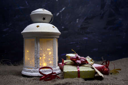 Festive concept for Christmas and New Year. A beautiful decorative lamp glows on a dark background with gift boxes, drums and a wooden Christmas tree