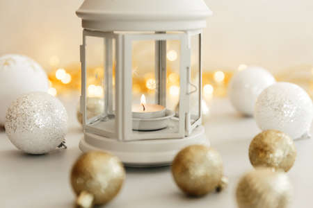 White vintage Lantern with burning candles, pine cones on wooden table and glitter lights background. Christmas background. happy New Year. Selective focus holidey.