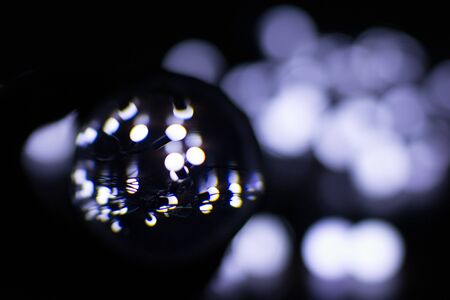 Little white lights on a garland through a magnifying glass, blur, creative background
