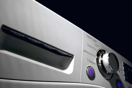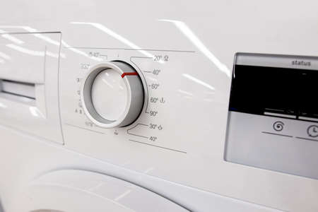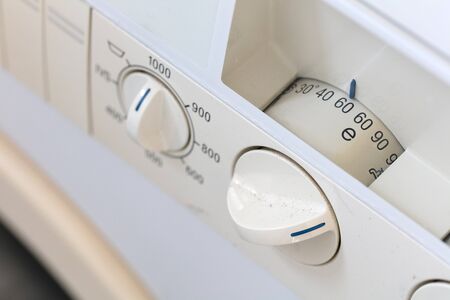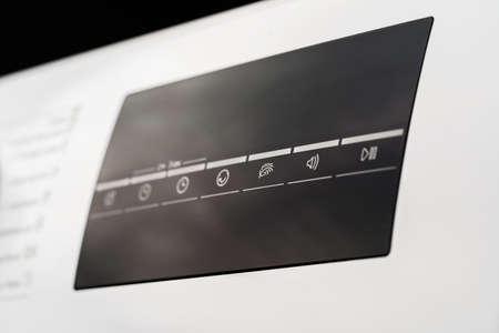 empty screen and buttons on control panel of modern washing machine on blurred background close view