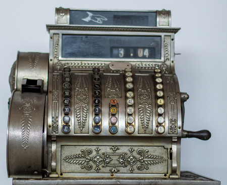 Open receipt printer for exchanging the thermal paper roll, old and used printer on white isolated background with dirt and grunge, connected to a cash register