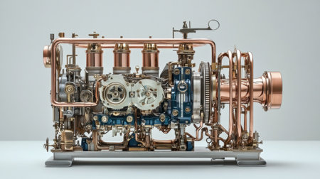 A stunning artisan model of a vintage engine showcases intricate copper and brass finishes. Ideal for mechanical enthusiasts, collectors, and artistic home decor.