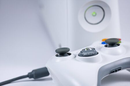 Taipei, Taiwan - June 20, 2019: A close-up shot of a white Microsoft XBOX One S system and controller on a black surface