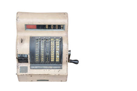 top view ancient and dirty calculator on white background, object, business, retro, vintage, copy space