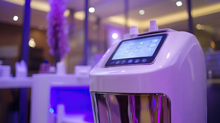 A sleek aesthetic device featuring a touchscreen display, placed in a stylish beauty spa with ambient lighting, ideal for skincare treatments and wellness.