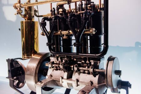 Part of lathe in workshop is close-up. Old lathe for metal processing stands in factory premises. Industrial background.