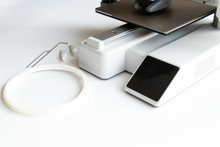 Desktop 3D printer with a spool of plastic filament on a white background. Modern technologies of additive manufacturing, digital education and prototyping