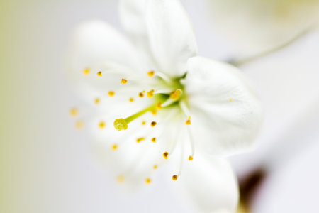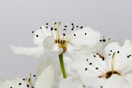 Macrophotography of fragile white tree blossoms with stamen and pistils in early springtime.