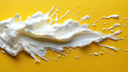 A dynamic composition presents a splash of white liquid against a vibrant yellow background. The image showcases a fluid form with textured details and fine splatters, exhibiting a sense of motion. This image could serve various purposes from advertising to design projects, providing a visually striking element.