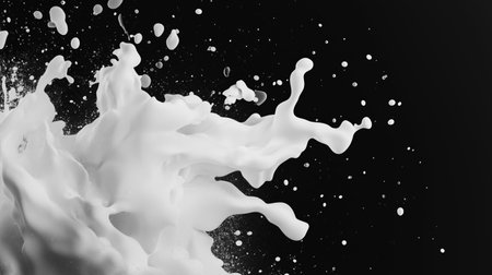 A stunning high-speed capture of a white liquid splash against a black background, showcasing fluid motion and texture, perfect for artistic and culinary themes.