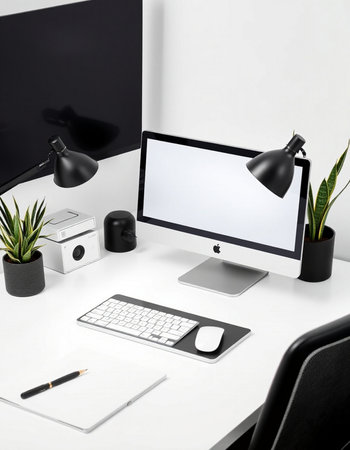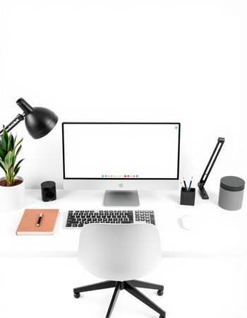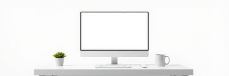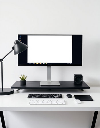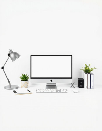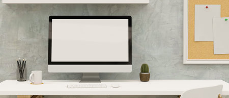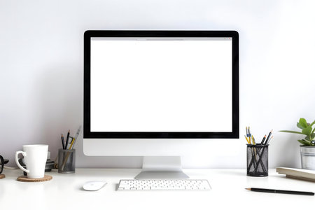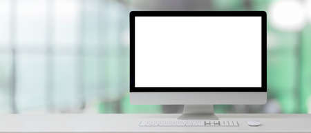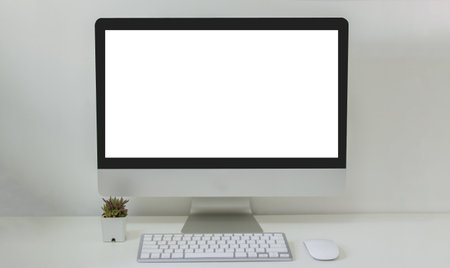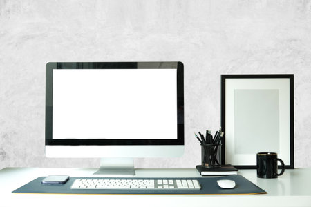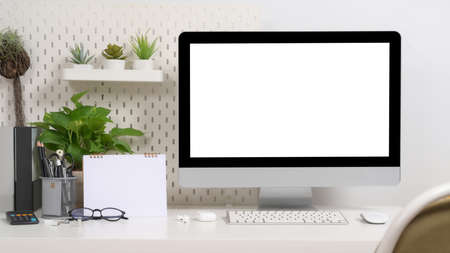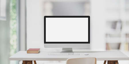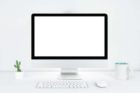 Modern workspace with blank screen computer on white desk in home office.