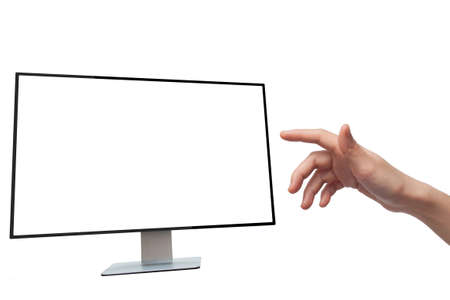 human hand visual touching blank screen computer on white background.