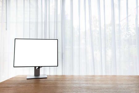 wood office table with blank screen on monitor on curtain window at home. view from office table.