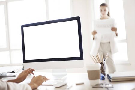 modern computer monitor template mock up on white and clean work desk with blank screen