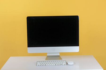 Photo of Computer monitor with white blank screen putting on white working desk on isolated yellow background.