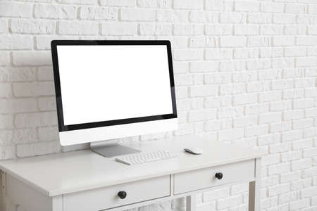 Modern computer on table near light wall