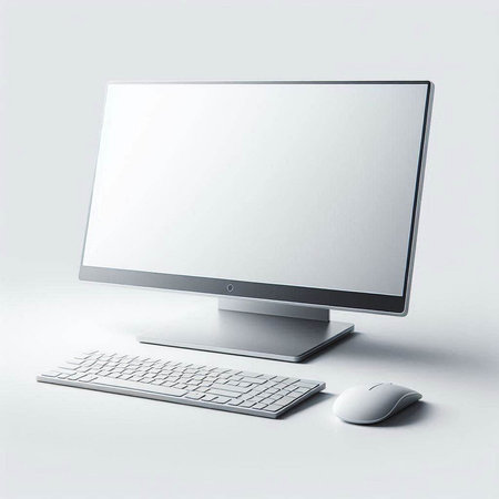 A clean image of a modern desktop computer with a blank white screen, isolated on a white background.