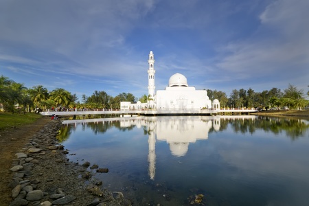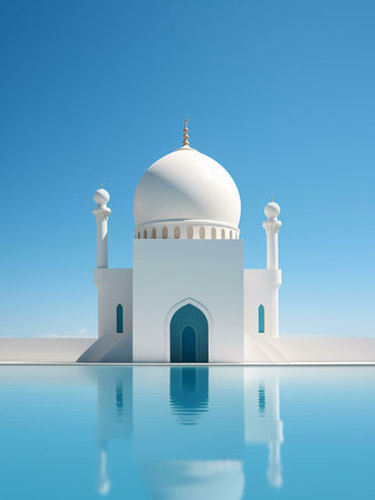 Serene lakeside mosque with white architectural details and reflection