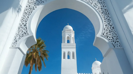 3D white mosque behind the arch with Islamic ornamental window and blue sky background, vector illustration, detailed and realistic. --chaos 30 --ar 16:9 --v 6.1 Job ID: 050a6467-0f6b-4d7a-8c05-0a030993ad80