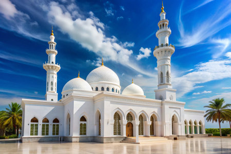 A striking white mosque stands tall with its dome and minarets, illuminated by natural light against a vivid blue sky and fluffy clouds, embodying peace and spirituality.