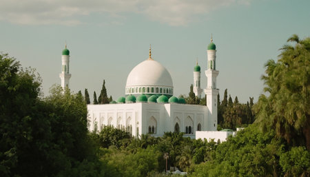 A white mosque, distinguished by its green-topped domes and minarets, is partially visible through a dense screen of lush green trees and foliage. The natural frame the religious structure, creating a harmonious blend of architecture and nature. Sunlight filters through the leaves, casting soft light on the building's ornate details and its characteristic Islamic evoking a feeling of tranquility and cultural significance.