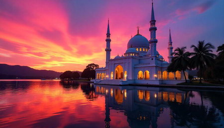 Serene mosque at dawn reflecting in tranquil water