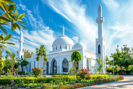 White mosque with towering minarets surrounded by vibrant garden under clear blue sky with clouds. Beautiful Islamic religion architecture