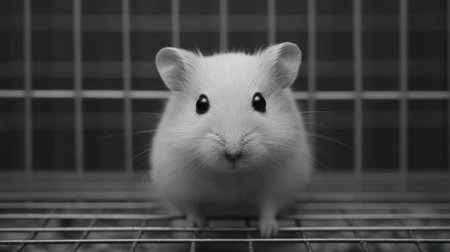 A charming close-up of an adorable small white hamster in a cage, showcasing its bright eyes and fluffy fur. Perfect for pet lovers and animal photography.
