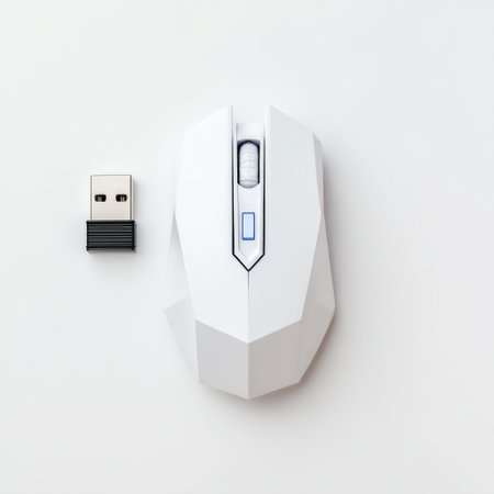 A sleek white wireless computer mouse paired with a USB receiver centered on a clean minimalist background, ideal for modern workspaces and tech enthusiasts.