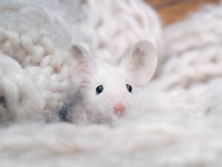 White cute rat hiding in a warm scarf