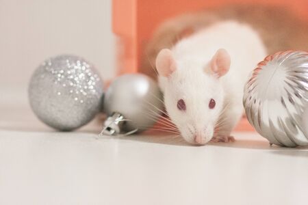 The rat is white, a symbol of the new year, the Chinese calendar, among New Year's toys. silver balls