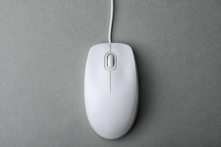 Modern wired computer mouse on gray background, top view