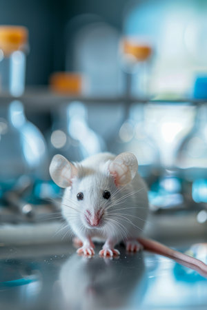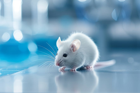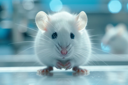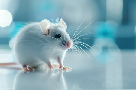 White laboratory mouse in bio lab environment with blurred background, ideal for text placement