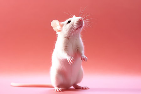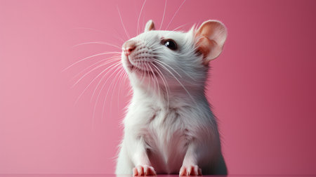a cute rat is captured in a realistic hyper-detailed portrait on a pink background inside a house. the isolated image showcases the rat's white, smooth, and shiny fur, contrasting against the dark white and light crimson tones. this wildlife photograph, taken in the style of stk reklama, is a captivating composition found on daz3d and flickr. ai generated