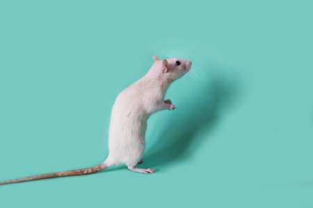 Cute detailed portrait of a young white rat standing side ways on hind legs. Isolated on a green background.