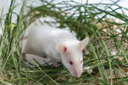 White albino laboratory mouse sitting in green dried grass, hay. Cute little rodent muzzle close up, pet animal concept.