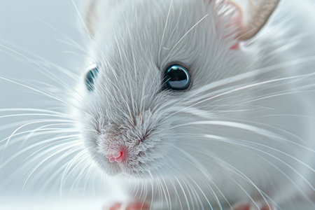 A charming close-up of a white mouse with a pink nose and long whiskers, showcasing its delicate features against a pure white background. Ideal for educational or pet care themes.