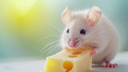 A white mouse eating a piece of cheese on the table, AI