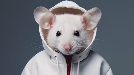 a white rat mouse wearing a blue hoodie and black sweater stands against a grey background, exuding a futuristic sci-fi aesthetic. the image captures the essence of artists like miles aldridge, petrina hicks, and rick owens, with a color palette of white, maroon, and dark white and red. the ultra hd quality enhances the visual impact of this unique composition. ai generated