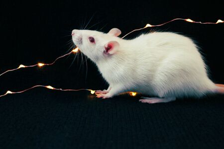White rat on black background with garland, symbol of the new year 2020