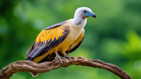 A striking bird with yellow and black feathers sits elegantly on a branch. The lush green background enhances the bird's vibrant colors, showing nature's beauty in a serene setting.