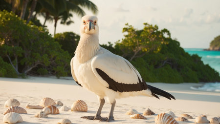 AI Generated. Majestic Dodo Bird on Tranquil Island Shoreline with Seashells and Lush Jungle Background